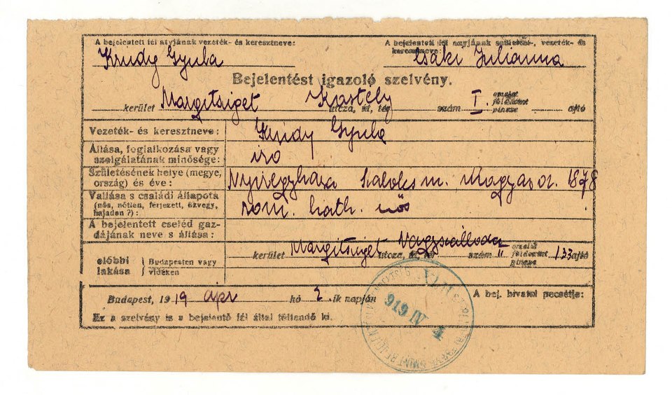 : Krúdy Gyula margitszigeti bejelentést igazoló szelvénye.