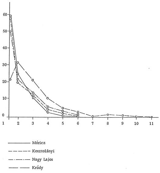 Kosztolányi-, Krúdy- és Móricz-szövegek kvantitatív vizsgálatának eredményeit